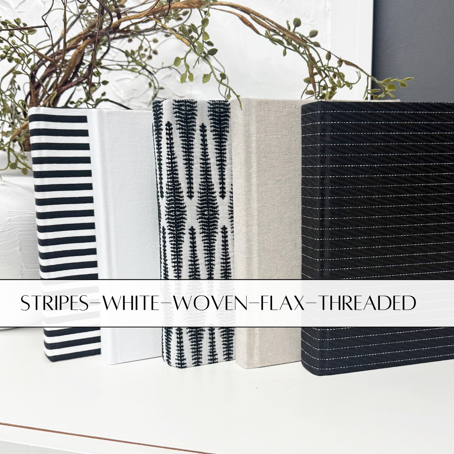 Brand New Books (other sellers wrap used books). Real, authentic books in various genres. Fully wrapped (cover, spine, and inside cover) for a cohesive, seamless look. Completely solid color throughout (can't see through fabrics and linen). Natural spine that doesn't look boxy like faux books. Intense quality control. In stock, ready to ship.