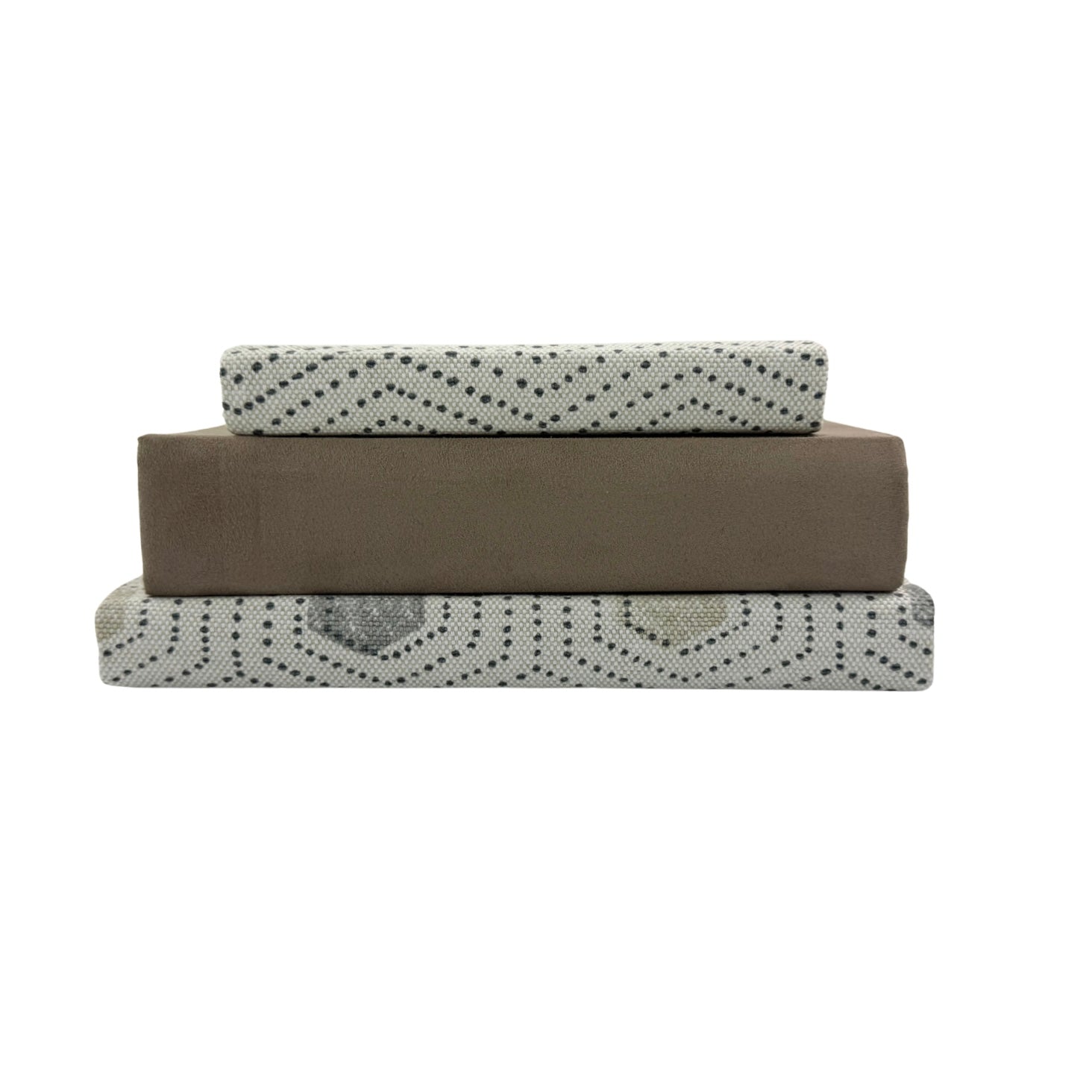 This beige, pink, and brown decorative book set is perfect for any mantel or shelf decor. These books are covered in fabric which is adhered to the spine, cover, and inside. Patterns and colors are picked to give any room texture and depth.